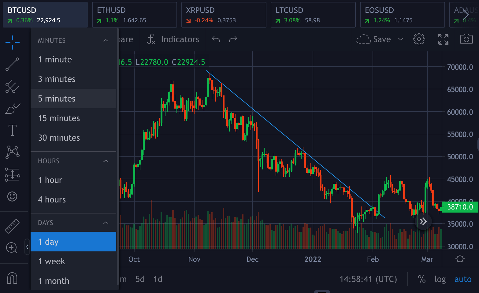 3. Candlestick - Clicking on the candles icon will allow you to change from a line chart to candles or whichever you prefer.